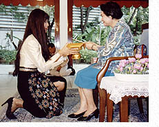 On June 16, 1999, Her Royal Highness Princess Galyani Vadhana granted an audience to watercolour artist Somjai Reiss and family. On the occasion Somjai Reiss donated the proceeds of her recent solo watercolour exhibition "MY BELOVED THAILAND 1999" to the Slum Child Care Foundation under the royal patronage of H.R.H. Princess Galyani Vadhana. |